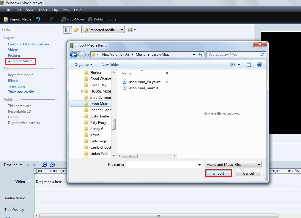 1. Buka program Windows Movie Maker, kemudian pada menu IMPORT pilih AUDIO OR MUSIC. Silahkan pilih lagu apa saja yang ingin Anda gabungkan. Klik IMPORT !