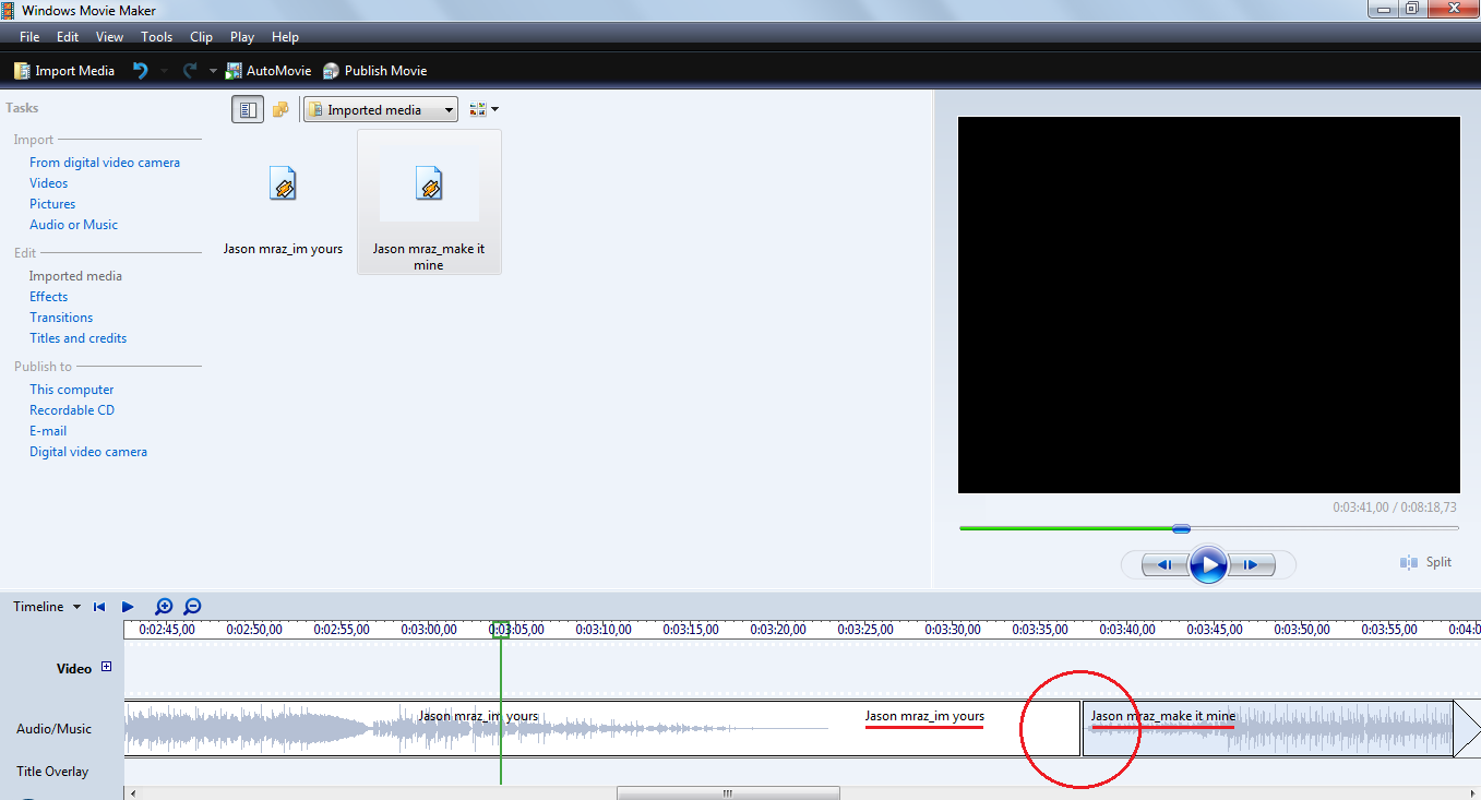 Demikianlah tips singkat cara menggabungkan lagu mp3 menggunakan Windows Movie Maker. Dibawah ini adalah screenshot lagu Jason Mraz yang berjudul "I'm yours and Make it mine", terlihat durasi lebih dari 8 menit karena memang dalam satu lagu ini terdapat dua lagu. Semoga bermanfaat.