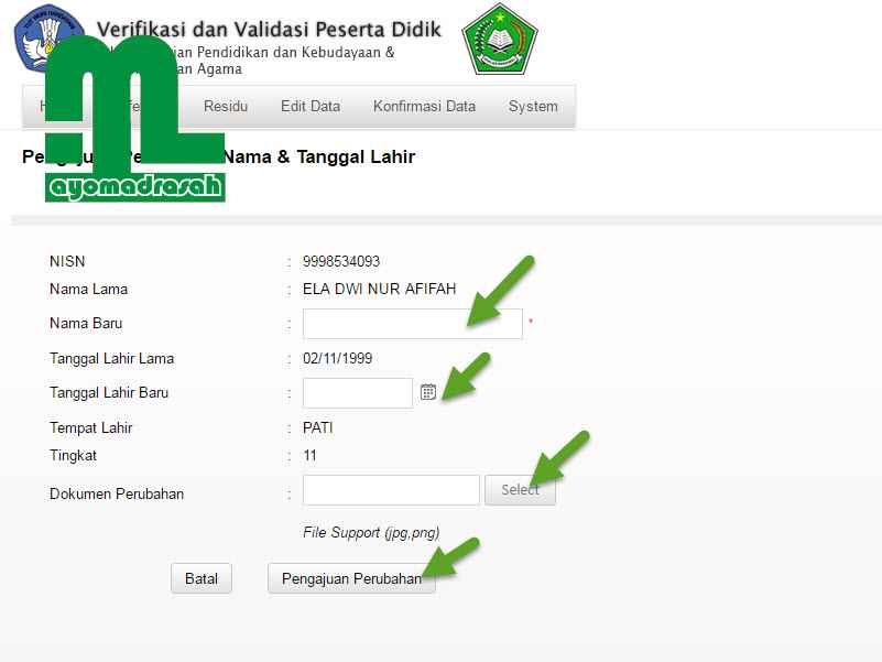 Perubahan identitas siswa dilakukan ketika nama atau tanggal lahir siswa mengalami kesalahan.