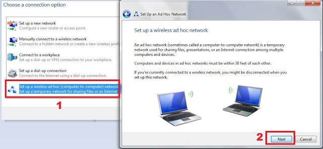 langkah 2Berikutnya pada menu choose conection option pilih Set up a wireless ad hoc (computer-to-computer) network, kemudian klik next. berikutnya isikan network name, security type dan security key, jika telah selesai klik tombol centang "Save this network" lalu klik next. selanjutnya akan muncul konfigurasi baru lagi, maka klik close saja. seperti penampakkan gambar dibawah