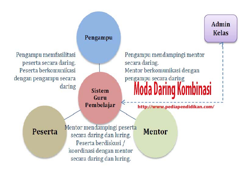 Sahabat Dunia Pendidikan yang berbahagia. Pada moda kombinasi ini, peserta melakukan interaksi belajar secara daring dan tatap muka. Interaksi belajar daring dilakukan secara mandiri dengan memanfaatkan teknologi informasi dan pembelajaran yang telah disiapkan secara elektronik, dan dapat dilakukan kapan saja dan dimana saja. Interaksi tatap muka dilaksanakan bersamaan dengan peserta lainnya di pusat belajar (PB) yang telah ditetapkan dan difasilitasi oleh seorang mentor. Interaksi pada daring kombinasi dapat dilihat pada Gambar dibawah ini :
