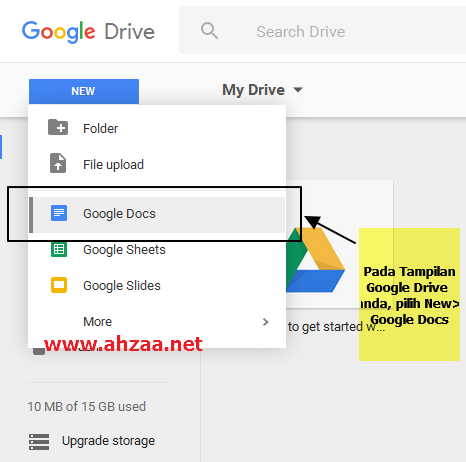 3. Pilih New pada sebelah kiri atas lalu klik Google Docs.