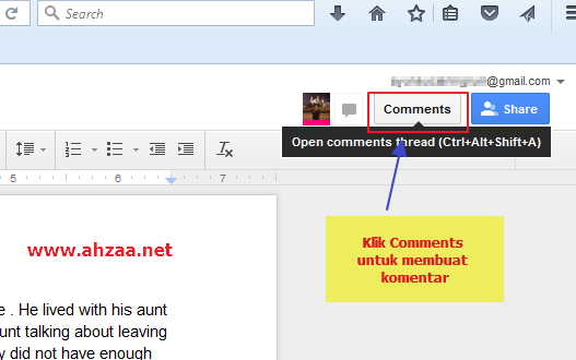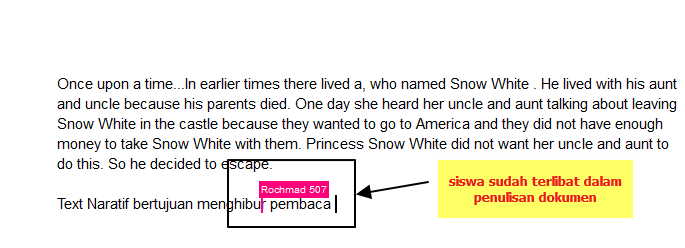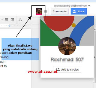 8. Libatkan siswa yang sudah kita undang tadi dalam penulisan dokumen kita melalui Google Docs pada akun mereka. Hasil tulisan dari siswa kita akan ditandai dengan warna penanda yang berbeda. Tulisan akan bisa dilihat dan di review oleh semua anggota komunitas menulis. 9. Mudah bukan? Bila kita menemukan kesalahan atas tulisan siswa, silahkan klik komentar pada bagian pojok kanan atas tampilan menu Google Docs kita, maka kita akan dibawa menuju Thread atau diskusi tentang tulisan atau dokumen yang sudah ditulis.
