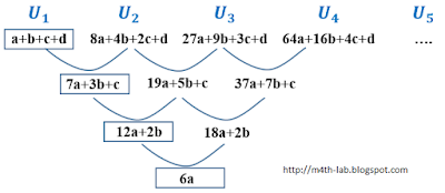 Kita telah mengetahui bahwa rumus untuk menentukan suku ke-$n$ dari barisan aritmetika tingkat tiga akan berupa fungsi polinomial berderajat tiga, kita misalkan fungsi tersebut adalah :$$U_n=an^3+bn^2+cn+d$$