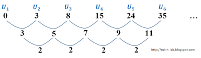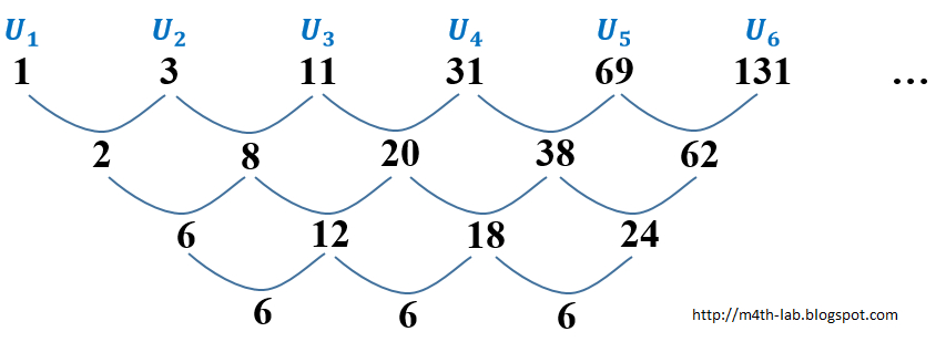 Jika kita substitusi $n=1, 2, 3, \cdots $ ke $U_n=an^2+bn+c$ maka kita peroleh: