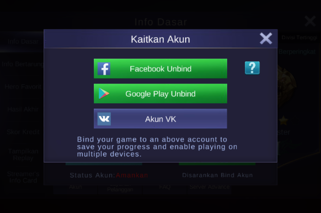 Nah, untuk mengatasi hal tersebut bisa mengaitkan terlebih dahulu dengan "Akun Bind" Mobile Legens, Lalu Apa itu Akun Bind? Akun Bind pada game Mobile Legends adalah sebutan untuk mengaitkan akun Mobile Legends dengan akun yang sudah ada diantaranya akun Facebook, akun Google Play Game, dan akun VK. Jika kita sudah mengaitkan minimal satu saja, sudah dipastikan akun kita akan aman dan terhindar dari hilangnya akun Mobile Legends.