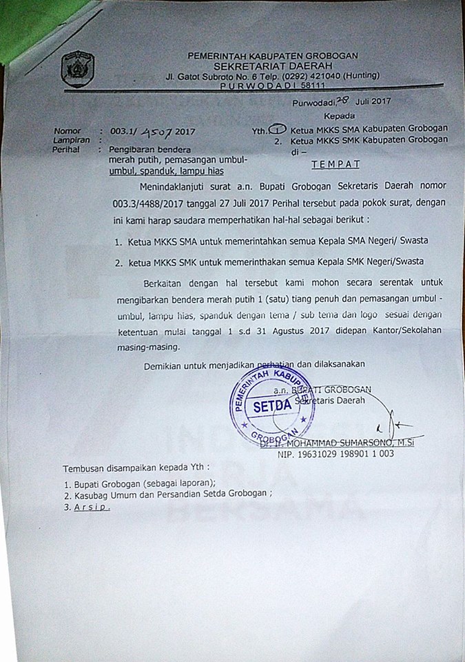 Menindaklanjuti surat a.n. Bupati Grobogan Sekretaris Daerah Nomor 003.3/4488/2017 tanggal 27 Juli 2017 Perihal Pengibaran Bendera Merah Putih , Pemasangan Umbul-umbul, spanduk serta lampu hias.