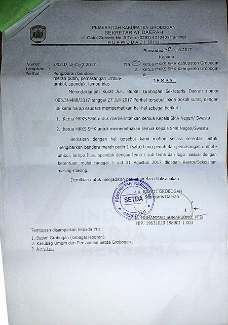 Berkaitan dengan hal tersebut maka dimohon untuk SMA dan SMK Negeri dan Swasta di Kabupaten Grobogan serentak untuk mengibarkan bendera merah putih 1(satu) tiang penuh dan pemasangan umbul-umbul, lampu hias, spanduk dengan tema/sub tema dan logo sesuai dengan ketentuan mulai tanggal 1 s.d. 31 Agustus 2017 di depan Kantor/Sekolahan masing-masing.