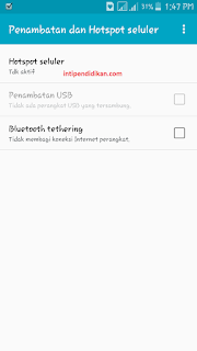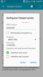 - b. pengaman : bisa anda isi apa saja dengan memilih opsi WPA2 PSK, sebagai pengaman jaringan anda untuk menghindari ada pengguna lain yang ingin memakai jaringan anda, kini selesai anda menyeting wifi diandroid anda sekarang centang aktifkan hotspot tethring anda