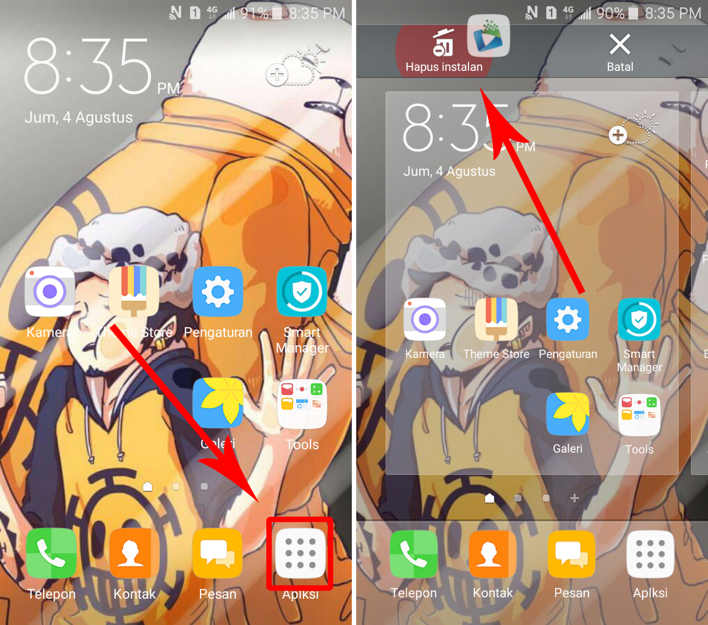 1. Pertama silahkan masuk ke menu Aplikasi.2. Kemudian pilih aplikasi yang ingin dihapus, lalu tekan atau tahan pada aplikasi tersebut dan akan muncul menu penghapusan atau hapus installasi dibagian atas.