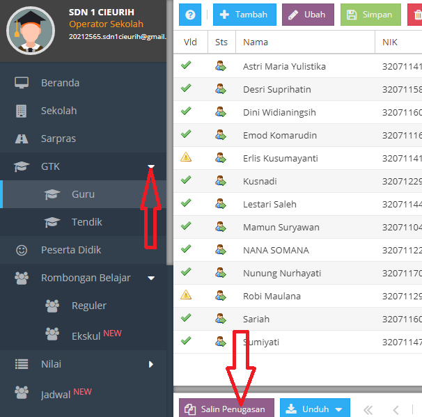 - Untuk kelengkapan data guru, klik Menu GTK, Klik Guru. Jika data guru belum ada, klik penugasan untuk menyalin data guru dari arsip.