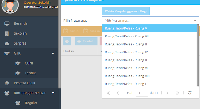 - Setelah pembelajaran diisi lengkap, kini saatnya membuat jadwal pelajaran. Klik menu jadwal dan pilih rombel yang ingin dibuatkan jadwalnya dengan mengklik Pilih Prasarana.
