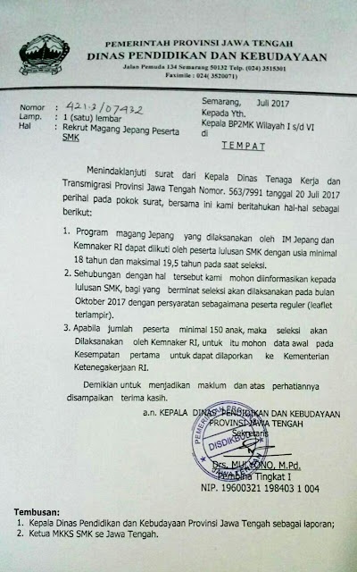 berikut ini informasi tentang Program Magang Ke-Jepang untuk Peserta SMK. Sesuai dengan surat Kepala Dinas Pendidikan dan Kebudayaan Provinsi Jawa Tengah dijelaskan bahwa;