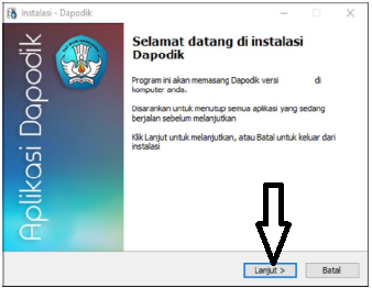 - Jendela instalasi Dapodikdasmen 2018 akan muncul. Klik lanjut untuk meneruskan instalasi.
