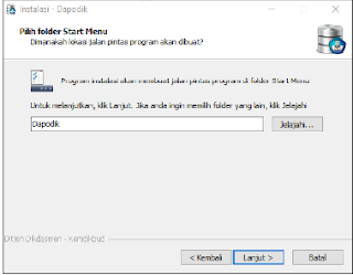 - Pada jendela "Pilih folder Start Menu" Secara default, sistem akan otomatis mengisi “Dapodik”. Pilih “Lanjut”.