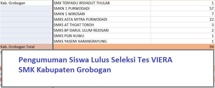 Berikut ini daftra nama siswa peserta test VIERA (Pra TOEIC) yang yang dinyatakan lulus untuk Kabupaten Grobogan. Seperti pengumuman yang telah diterbitkan oleh Direktorat PSMK dalam website resminya http://psmk.kemdikbud.go.id/ terdapat juga siswa siswi SMK di Kabupaten Grobogan yang lolos seleksi ini.