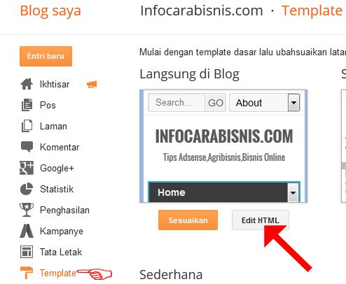 Untuk mengubah warna background blog, anda harus login di blogger.com, setelah masuk di dasbor blogger, silakan Anda mengeklik "template" kemudian klik "edit HTML"