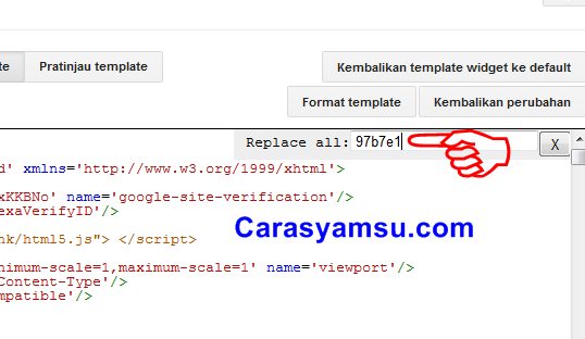 ( peletakkan crusornya bebas di mana pun, yang penting masih dalam kotak halaman edit HTML, namun enaknya ya di bagian atas ), kemudian tekan tombol CTRL + SHIFT + R secara bersamaan sehingga akan muncul tulisan "Replace all", selanjutnya isi/masukkan kode warna bakcground lama di kolom replace all tersebut (pada contoh di bawah ini saya memasukkan kode 97b7e1), kemudian klik/tekan tombol "ENTER".