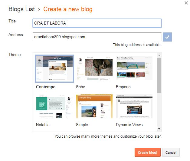 Isi judul blog, alamat blog dan pilih tema yang akan di tampilkan pada blog anda