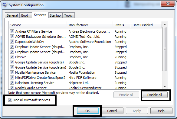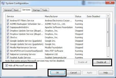 4.Kemudian pilih tab Services >> Hide All Microsfot services >> Dsiable All >> OK .