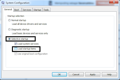 3.Silahkan pilih General >> Selective Start up >> dibawah selective start up hilangkan centang load start up items .
