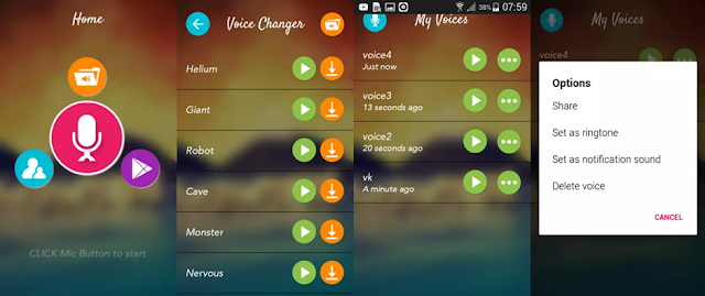 Aplikasi yang kedua adalah Voice Changer And Sound Effect. Aplikasi ini merupakan salah satu aplikasi yang dapat digunakan untuk mengubah suara kalian. Aplikasi ini akan merekan suara kalian dan memodifikasi sura kalian sesuai pilihan yang kalian pilih.