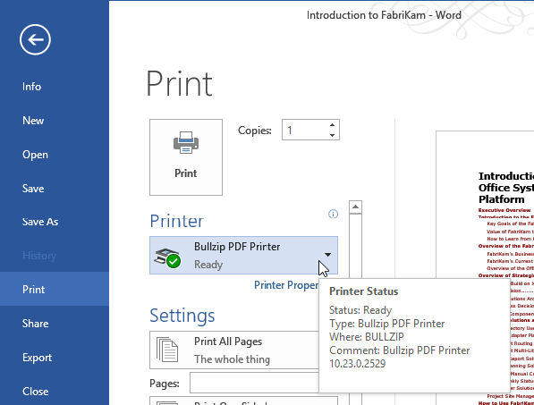 Sebagai alternatif lainnya agar file PDF yang dihasilkan sizenya tidak terlalu besar, penulis mencoba software yang bernama Bullzip PDF Printer. Sesuai dengan namanya, software ini akan difungsikan sebagai sebuah printer. Jadi saat hendak membuat file PDF, misalnya dari dokumen Word, maka kita tinggal mencetak saja dokumen tersebut, namun printer yang digunakan untuk mencetak bukan printer fisik melainkan Bulzip PDF Printer ini.
