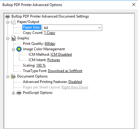 Disini kita dapat mengatur Bullzip PDF Printer seperti halnya printer biasa, misalnya untuk mengatur ukuran kertas default, pencetakan warna atau hitam-putih, dan lain sebagainya.