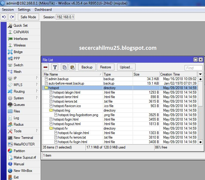 5. Silahkan upload file alogin.html ke folder "hotspot" pada Mikrotik.