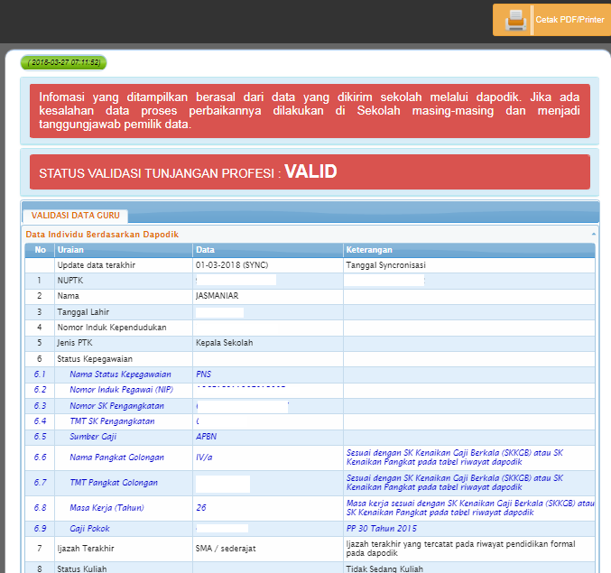 3.Masuk di halaman Info GTK, silahkan para operator ataupun guru untuk memeriksa, apakah info GTK sudah valid atau belum. Jika sudah valid seperti gambar dibawah ini, silahkan simpan atau cetak langsung halaman Info GTK.