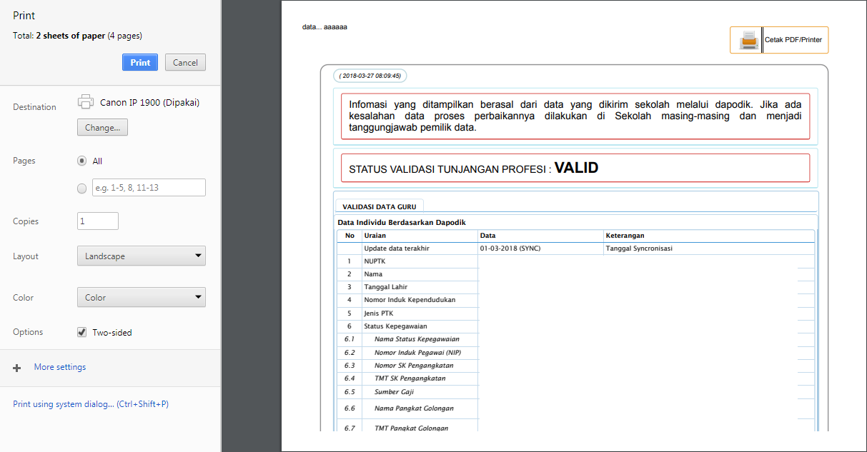 1.Caranya juga sama seperti menyimpan halaman info GTK diatas, silahkan para operator ataupun guru tekan secara bersamaan CTRL + P di keyboard. Lalu akan masuk ke halaman seperti berikut.