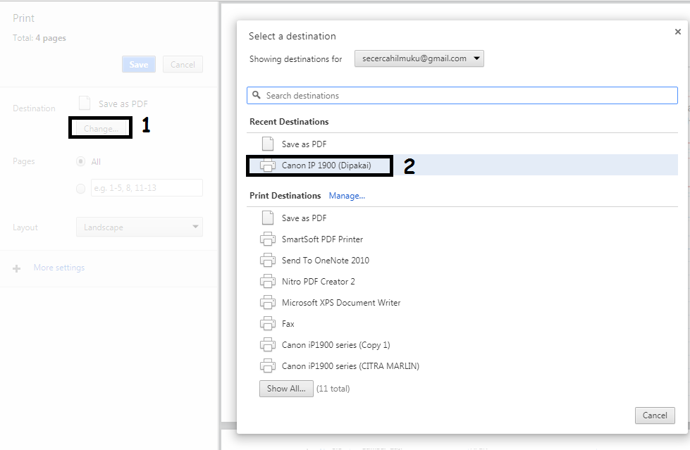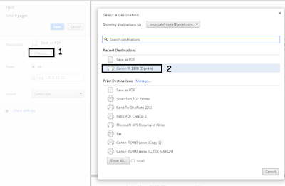 Lihat pada Destination, apabila masih dalama bentuk Save as PDF silahkan rubah dalam format printer anda, disini admin menggunakan printer Canon IP 1900, jadi admin klik pada printer tersebut. Caranya: