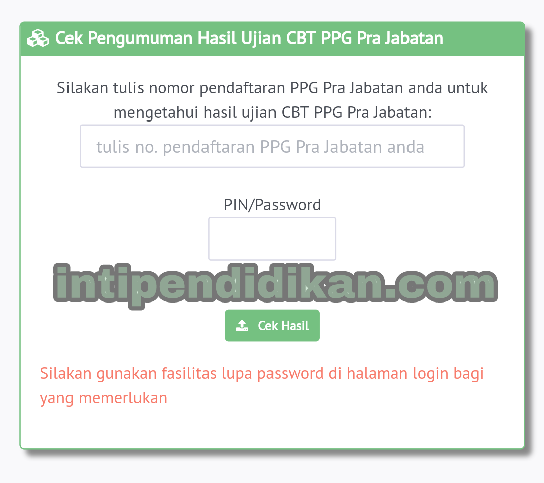 Sumber https://www.intipendidikan.com/Sehubungan dengan hal tersebut, Direktorat Pembelajaran telah melaksanaka rapat analisa hasil seleksi dan penetapan kelulusan seleksi akademik online dengan Tim Pusat Program PPG Ditjen Belmawa Kemenristekdikti untuk menentukan nama-nama peserta yang dinyatakan lolos seleksi akademik online Program PPG Prajabatan Bersubsidi Tahun 2018. Hasil seleksi dimaksud dapat dilihat di laman: ppg.ristekdikti.go.id/daftar menu Hasil Ujian CBT Prajabatan, dengan memasukkan Nomor Peserta dan Password masing-masing peserta.