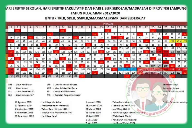 Mengingat tahun ajaran baru sebentar lagi perlunya di susun kalender pendidikan TK/PAUD, SD/MI, SMP/MTs, SMA/MA, SMK tahun pelajaran 2019/2020. Adapun Kalender Pendidikan Provinsi Lampung Tahun Pelajaran 2019/2020 adalah sebagai berikut: