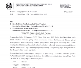 Assalamu'alaikum wr.wb. sahabat IndoINT, berdasarkan Surat panggilan yang dikeluarkan oleh Kementerian Riset, Teknologi dan Pendidikan Tinggi Universitas Negeri Surabaya (UNESA) bernomor 008791/UN.38.I/TU/2018 Mengenai Hal : Ujian Ulang UTL Peserta PLPG 2016 2017.
