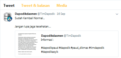 Berdasarkan pemberitahuan dari @TimDapodik, diberitahukan kepada Operator Dapodik PAUD dan Dikmas, dikarenakan adanya pekerjaan perawatan kelistrikan di lingkungan Kementerian Pendidikan dan Kebudayaan yang rencananya akan dilakukan mulai besok 15 September 2018 pagi, dengan ini diberitahukan bahwa seluruh layanan Dapodik PAUD-Dikmas (Dapodik Online, Sync Dapodik, Manajemen Dapodik dan lain-lain) akan berhenti sementara mulai 15 September 2018 pukul 00;00pagi, dan diperkirakan akan kembali pulih 16 September 2018 pukul 00:00 pagi.
