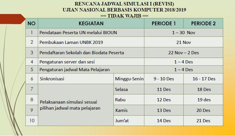 Silahkan anda baca baik-baik jadwal tersebut, supaya sekolah/madrasah anda tidak ketinggalan waktu dalam persiapan simulasi.