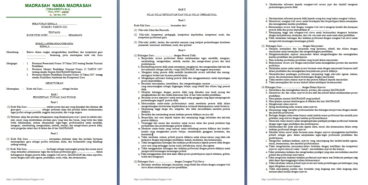 (2) Kode Etik Guru ............................... berfungsi sebagai seperangkat prinsip dan norma moral yang melandasi pelaksanaan tugas dan layanan profesional guru ............................... dalam hubungannya dengan peserta didik, orangtua/wali siswa, MADRASAH dan rekan seprofesi, sesuai dengan nilai-nilai agama, pendidikan, sosial, etika, dan kemanusiaan.
