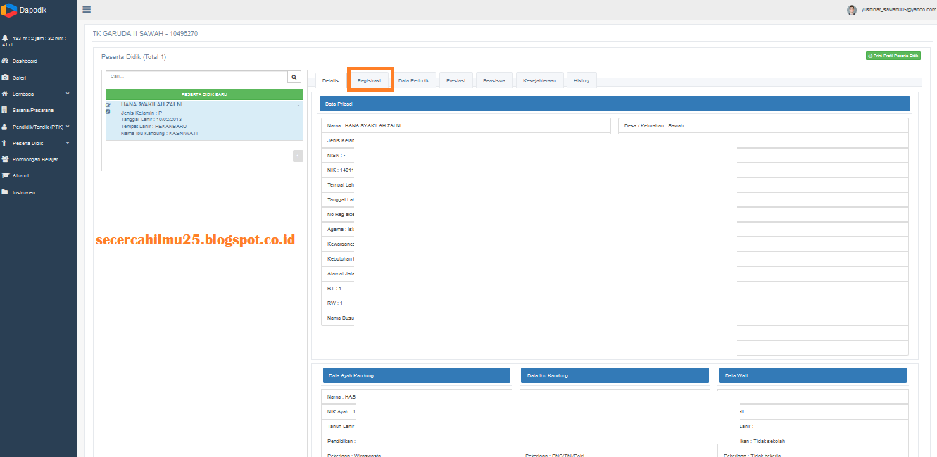 5. Berikut ini adalah tampilan data peserta didik yang telah berhasil disimpan, langkah selanjutnya kita akan melakukan Registrasi.