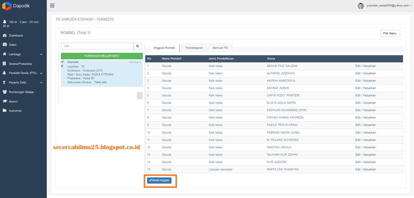 Silahkan klik pada rombel yang akan dimasukkan peserta didik ke dalam rombel tersebut, selanjutnya pada halaman Anggot Rombel silahkan klik pada tombol Tambah Anggota.