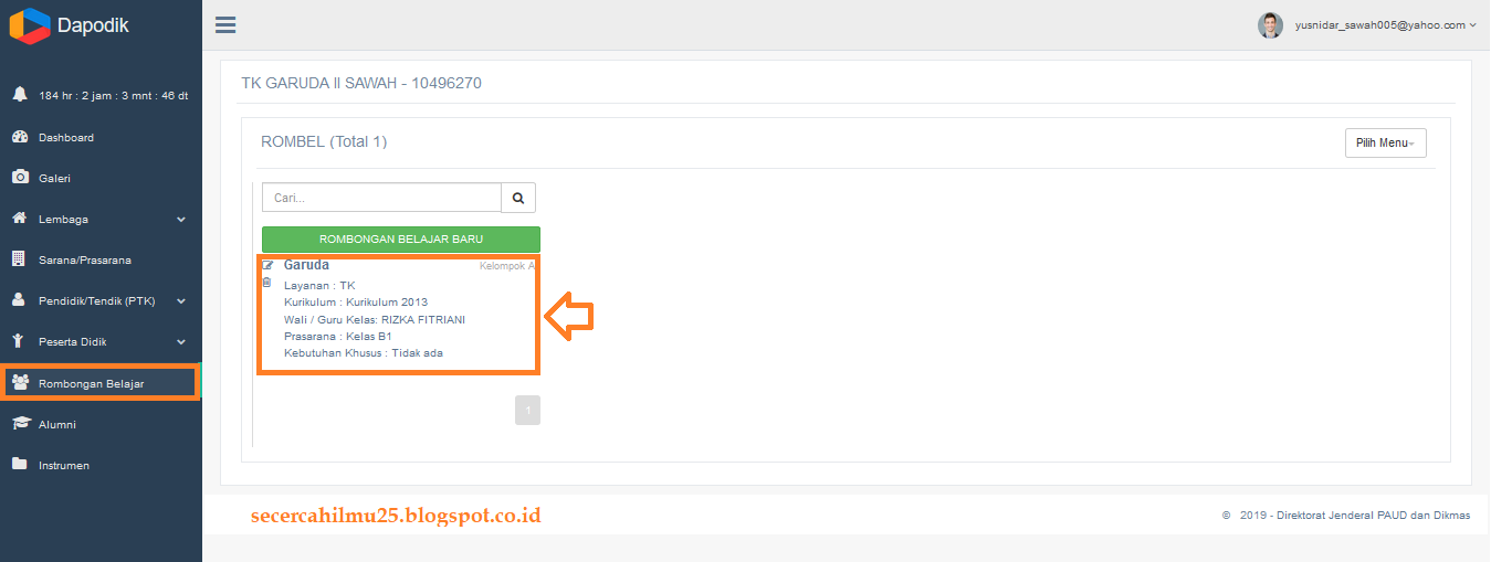 2. Masuk dihalaman utama Dapodik Online, silahkan klik pada Menu Rombongan Belajar.