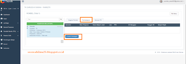 4. Selanjutnya masuk dihalaman Rombel, silahkan klik pada Menu Pembelajaran > klik tombol Tambah Pembelajaran.