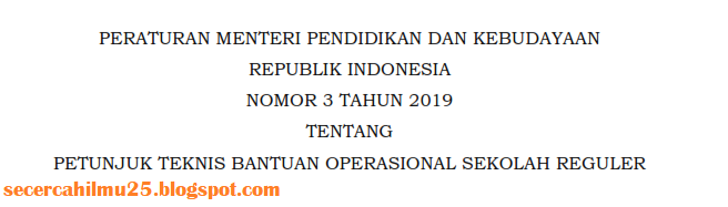 Permendikbud Nomor 3 Tahun 2019 tentang Petunjuk Teknis Bantuan Operasional Sekolah Reguler 2019, silahkan Download DISINI.