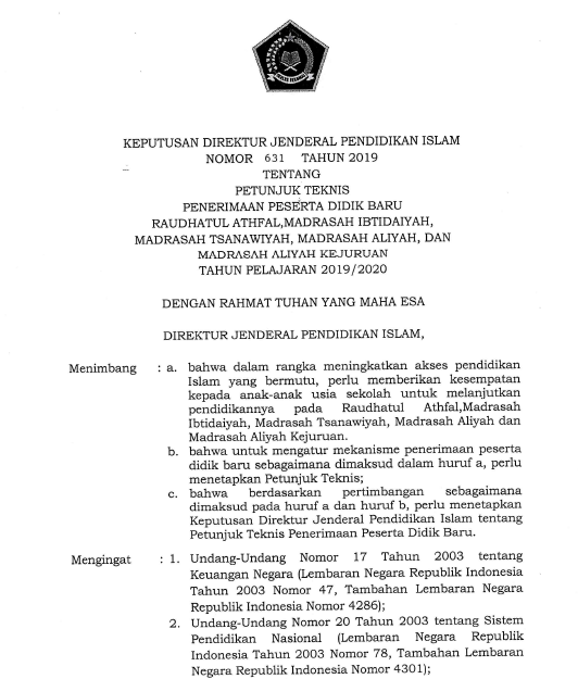 Direktur Jenderal Pendidikan Islam Kementerian Agama telah menerbitkan Keputusan Nomor 631 Tahun 2019 tentang Petunjuk Teknis Penerimaan Peserta Didik Baru Raudhatul Athfal, Madrasah Ibtidaiyah, Madrasah Tsanawiyah, Madrasah Aliyah dan Madrasah Aliyah Kejuruan Tahun Pelajaran 2019/2020.