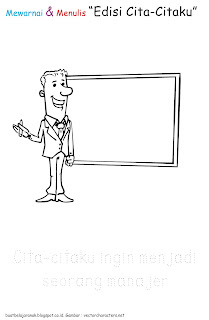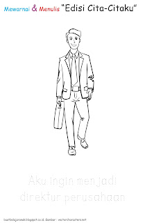 Menyambung lembar kerja mewarnai dan menulis edisi cita-citaku sebelumnya, berikut kami hadirkan lembar kerja edisi untuk bagian 2. Pada bagian kedua ini, menjadi seorang manajer atau direktur perusahaan adalah cita-cita yang akan digapai. Intinya dalam lembar kerja ini adalah menjadi seorang businessman. Sahabat bisa mengedit lembar kerja ini menggunakan aplikasi corel draw maupun yang lain, dengan catatan dilarang menghilangkan credit titlenya. Bila sahabat tertarik dengan lembar kerja ini, bisa mengunduhnya gratis pada link yang kami sediakan dibawah ini. Ada tiga jenis file yang bisa sahabat pilih yaitu jpg, pdf, dan cdr.