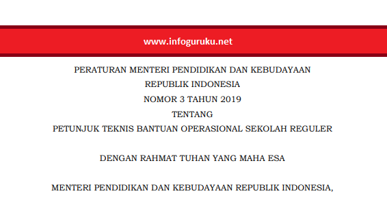 - Bahwa berdasarkan pertimbangan sebagaimana dimaksud dalam huruf a, huruf b, dan huruf c, perlu menetapkan Peraturan Menteri Pendidikan dan Kebudayaan tentang Petunjuk Teknis Bantuan Operasional Sekolah Reguler