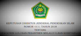 Keputusan Dirjen Pendis Nomor 4831 Tahun 2018 Tentang Juknis Rekognisi Lulusan Pesantren Melalui Ujian Kesetaraan ini menetapkan 1) Petunjuk Teknis Rekognisi Lulusan Pesantren Melalui Ujian Kesetaraan sebagaimana tercantum dalam Lampiran yang merupakan bagian tidak terpisahkan dari Keputusan ini; 2) Petunjuk teknis ini merupakan acuan bagi pelaksanaan ujian dalam rangka memberikan penghargaan sederajat atau kesetaraan dengan pendidikan formal jenjang pendidikan dasar dan menengah, bagi lulusan pesantren sebagai satuan pendidikan berupa pengajian kitab kuning atau dirasah islamiyah dengan pola pendidikan mu’allimin. 3) Penghargaan sederajat atau kesetaraan dengan pendidikan formal keagamaan Islam bagi lulusan pesantren yang dikeluarkan berdasarkan ketentuan sebelum keputusan ini ditetapkan, dinyatakan tetap berlaku.