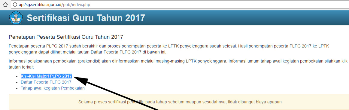 Adapun informasi terbaru terkait dengan Penetapan Peserta Sertifikasi Guru Tahun 2017 bahwasannya Penetapan peserta PLPG 2017 sudah berakhir dan proses penempatan peserta ke LPTK penyelenggara sudah selesai.