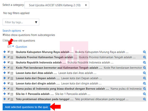 24. Klik pada icon yang ditunjuk oleh panah agar semua butir soal terpilih, kemudian klik Add selected questions to the quiz