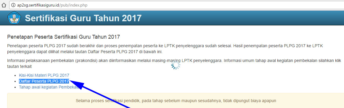 Adapun informasi terbaru terkait dengan Penetapan Peserta Sertifikasi Guru Tahun 2017 bahwasannya Penetapan peserta PLPG 2017 sudah berakhir dan proses penempatan peserta ke LPTK penyelenggara sudah selesai.